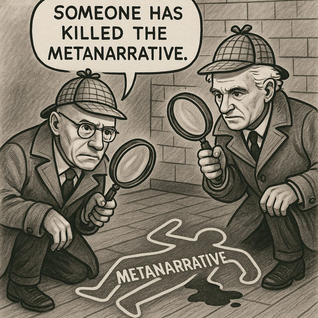 Ирония в том, что постмодерн объявил «смерть метанарративов» — мол, теперь у нас только маленькие истории. Но сама эта «смерть» тоже превратилась в новый метанарратив. Тюрьма без стен, где лозунг: «никаких больших рассказов».