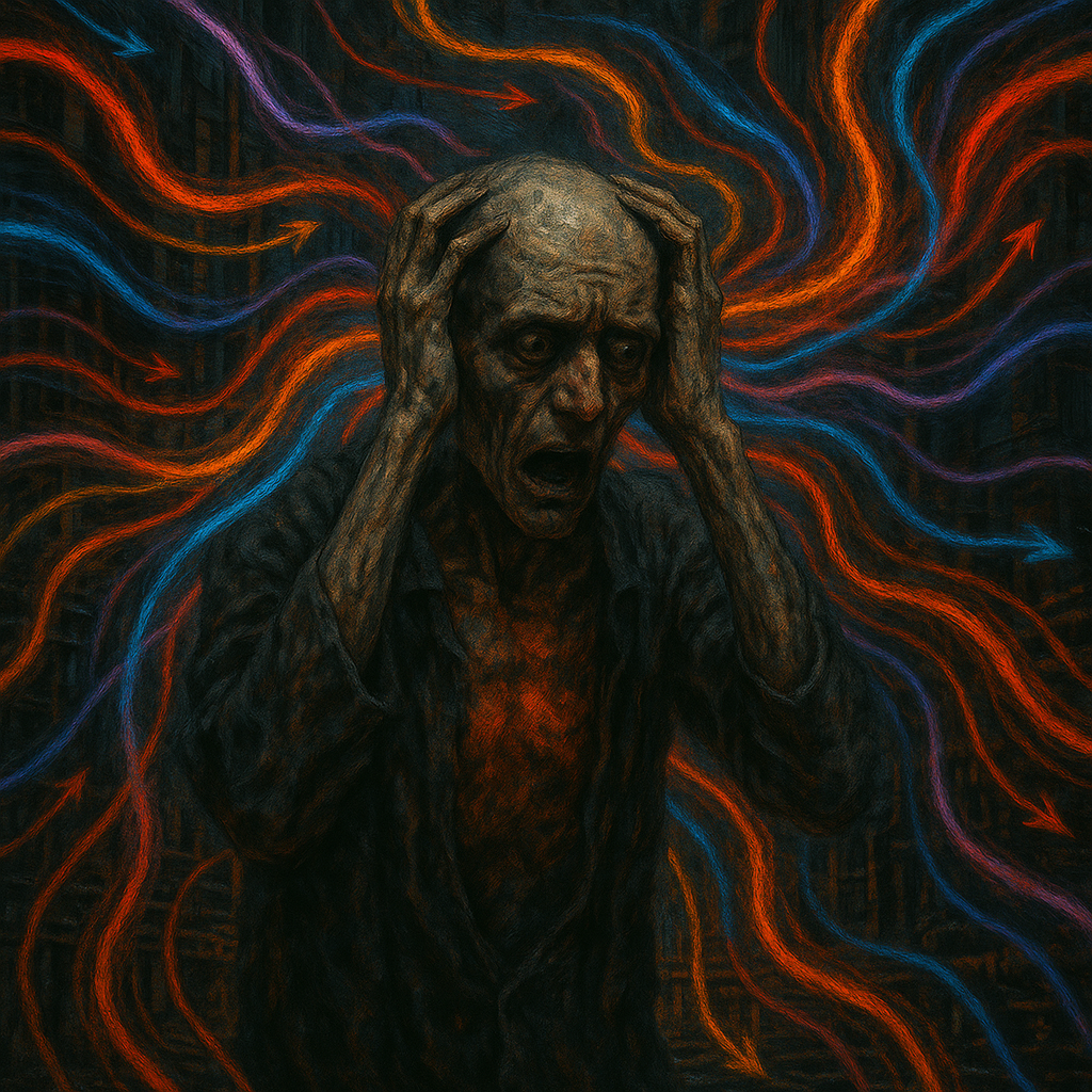 Делёз и Гваттари спорят с этим. Для них это не проекция тела вовне, не иллюзия. «Параноидальная машина» возникает прямо здесь, на месте столкновения. Это не фантазия, а реальный процесс: желающие машины продолжают соединяться, а тело без органов воспринимает это как пытку. Оно ощущает каждый орган как гвоздь, каждый поток как разрыв. И в этом напряжении само тело начинает переживаться как преследуемое, как атакуемое.