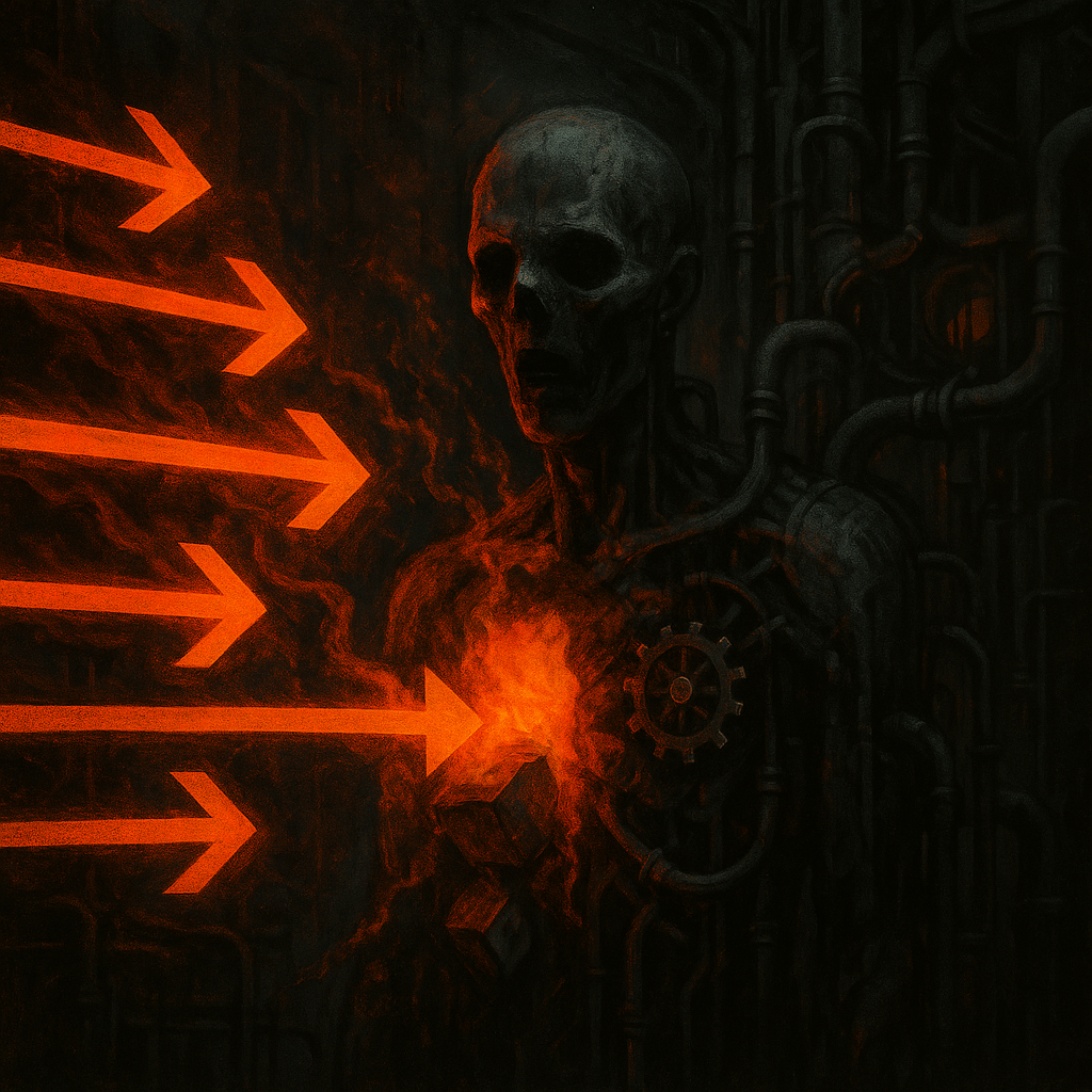 Представь мотор, который перегревается. В нём есть сама энергия работы, но в какой-то момент из неё же рождается сопротивление — трение, тепло, шум. Это не отдельный элемент, привнесённый кем-то. Это сам процесс, порождающий свой антипроцесс. Вот так и с ТБО.
